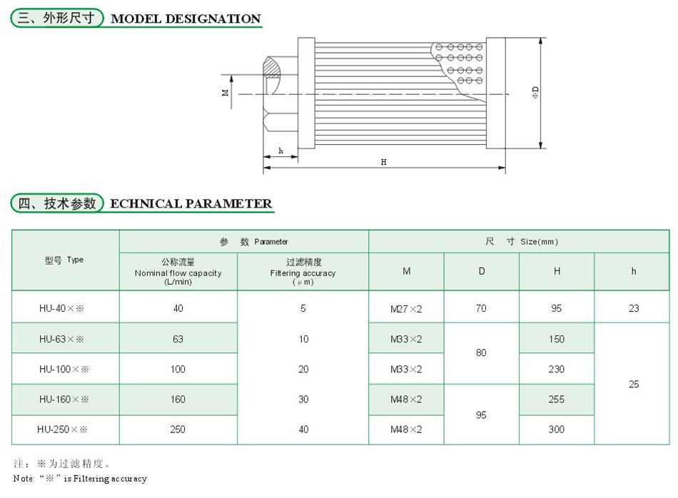 HU回油過濾器直接與回油管路螺紋連接,伸入油箱的油液中,結構簡單,使用安裝簡便。濾芯采用新型化纖濾材,具有通油能力大,過濾精度高,壓力損失小,納污量大等優(yōu)點。