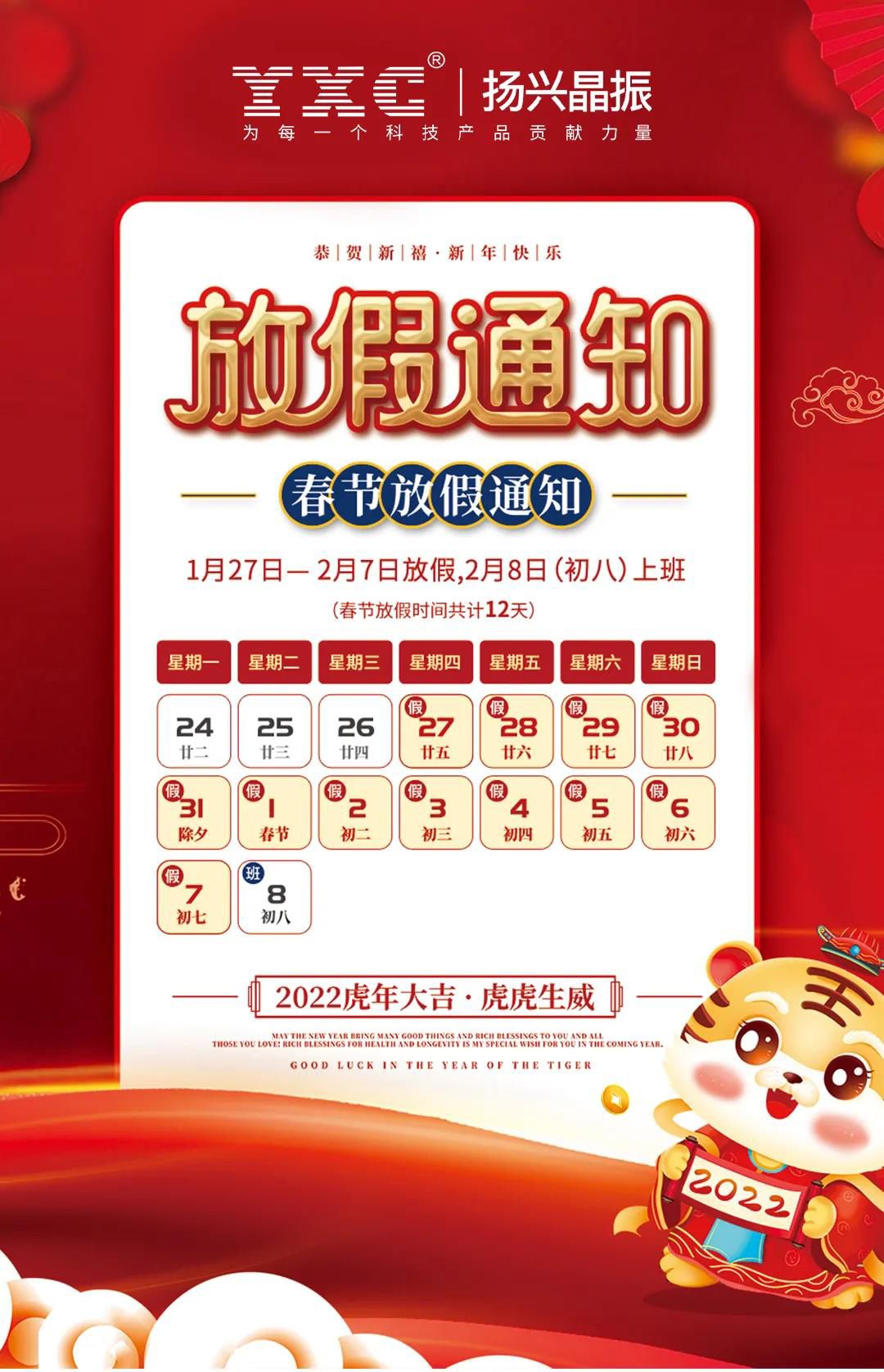 根據(jù)《國(guó)務(wù)院辦公廳關(guān)于2022年節(jié)假日安排的通知》,結(jié)合我司實(shí)際情況與工作安排,經(jīng)研究決定2022年春節(jié)放假安排如下:春節(jié)2022年1月27日--2022年2月7日放假,共12天;2月8日(初八)正常上班。