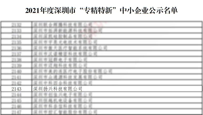 近日,深圳揚興科技有限公司成功入選工信局2021年度深圳市專精特新中小企業(yè)名單,獲評“專精特新”榮譽稱號。