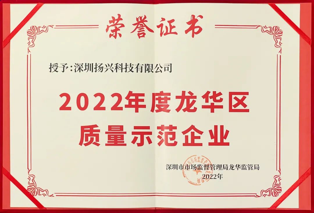 根據(jù)《深圳市龍華區(qū)質(zhì)量獎(jiǎng)管理辦法》實(shí)施細(xì)則,經(jīng)資格審查、材料評(píng)審、現(xiàn)場(chǎng)評(píng)審、局組委會(huì)審議、結(jié)果公示等程序,經(jīng)分管區(qū)領(lǐng)導(dǎo)同意,深圳市市場(chǎng)監(jiān)督管理局龍華監(jiān)督局授予深圳市揚(yáng)興科技有限公司為2022年龍華區(qū)質(zhì)量示范企業(yè)。