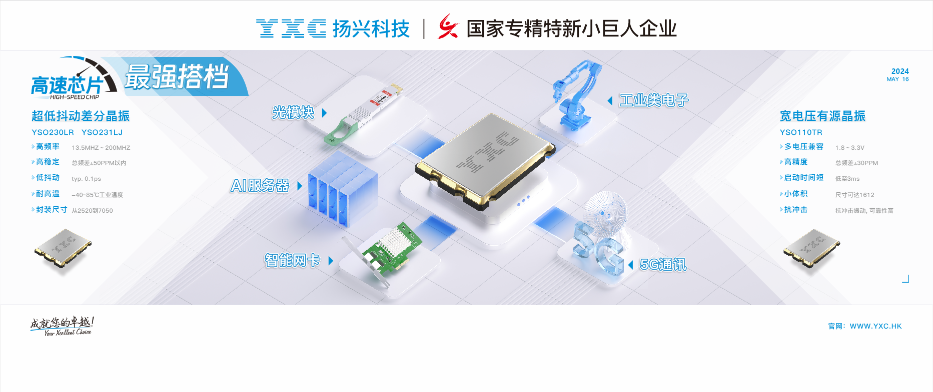 揚(yáng)興科技(YXC)專注晶振已38年,我們擁有先進(jìn)的測試儀器和經(jīng)驗(yàn)豐富的銷售技術(shù)團(tuán)隊(duì),專注于可編程晶振、石英振蕩器、石英晶體諧振器、時(shí)鐘晶振、陶瓷諧振器、TCXO溫補(bǔ)晶振等系列產(chǎn)品的研發(fā)與生產(chǎn)。揚(yáng)興科技的晶振產(chǎn)品廣泛應(yīng)用于光模塊、智能網(wǎng)卡、5G通信、AI服務(wù)器、3C數(shù)碼、智能家居、ADAS、車載影音、醫(yī)療、工業(yè)控制等眾多領(lǐng)域,為社會(huì)各行各業(yè)的智能化發(fā)展提供了堅(jiān)實(shí)的支撐。