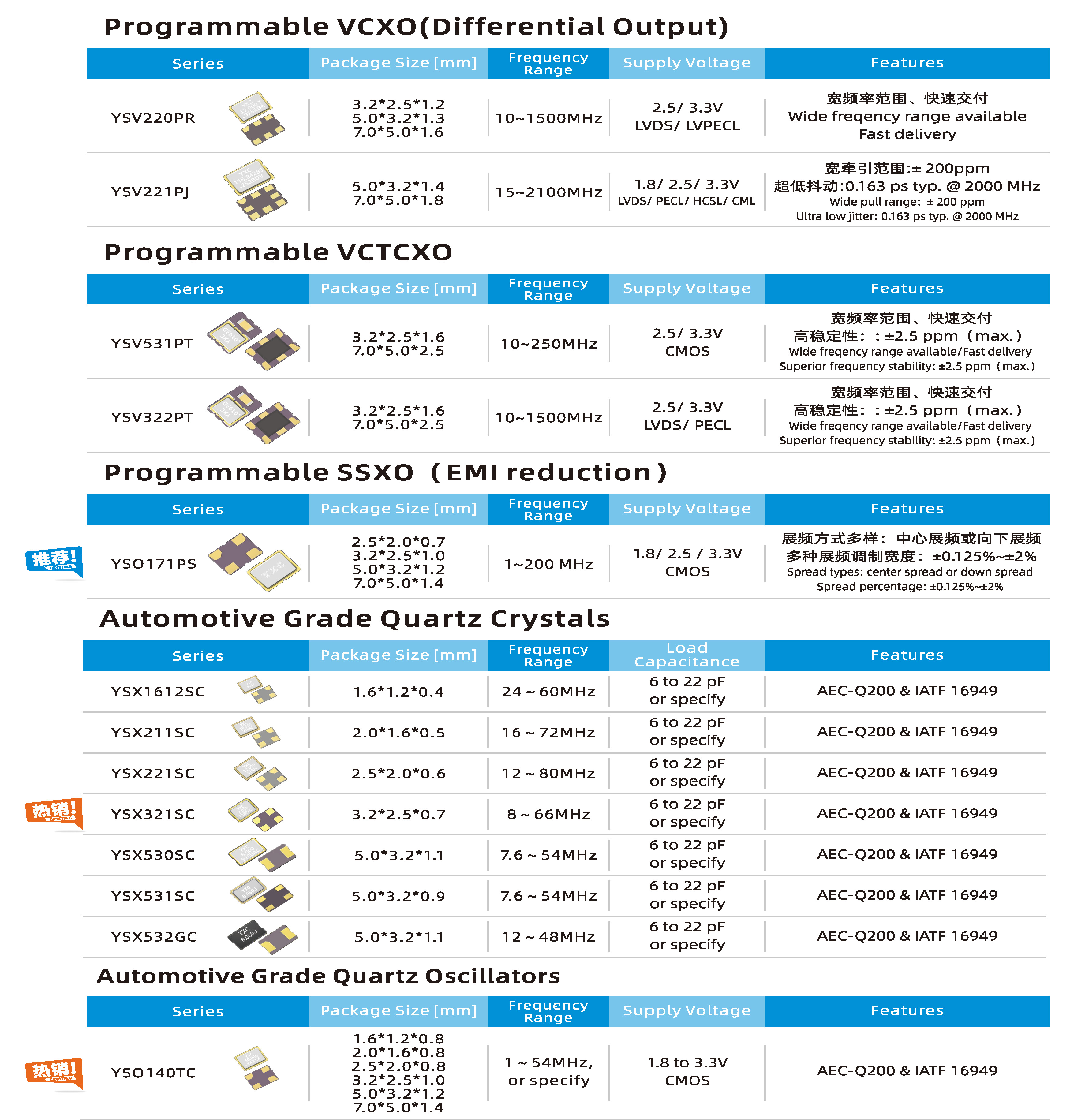 揚(yáng)興科技(YXC)深耕晶振行業(yè)已38年,目前擁有先進(jìn)的測(cè)試儀器和經(jīng)驗(yàn)豐富的銷售技術(shù)團(tuán)隊(duì),主營產(chǎn)品系列包括:可編程晶振、石英振蕩器、石英晶體諧振器、差分晶振、TCXO溫補(bǔ)晶振、OCXO恒溫晶振、陶瓷諧振器等。