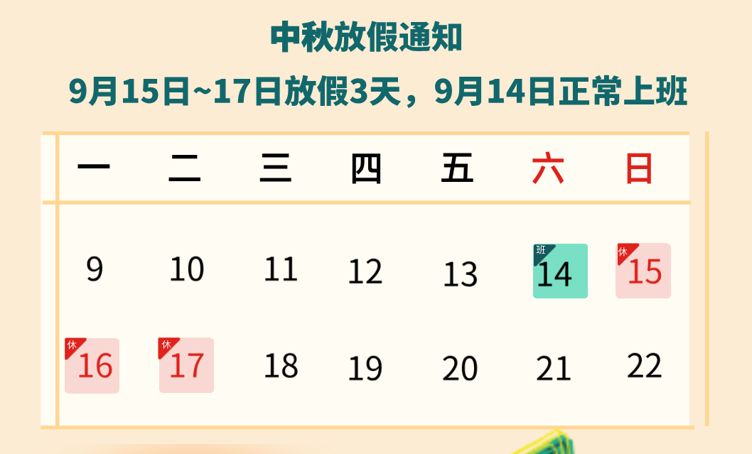 根據(jù)國務(wù)院辦公廳《關(guān)于2024年部分節(jié)假日安排的通知》,結(jié)合我司實(shí)際情況與工作安排,經(jīng)研究決定2024年中秋節(jié)放假安排通知如下: