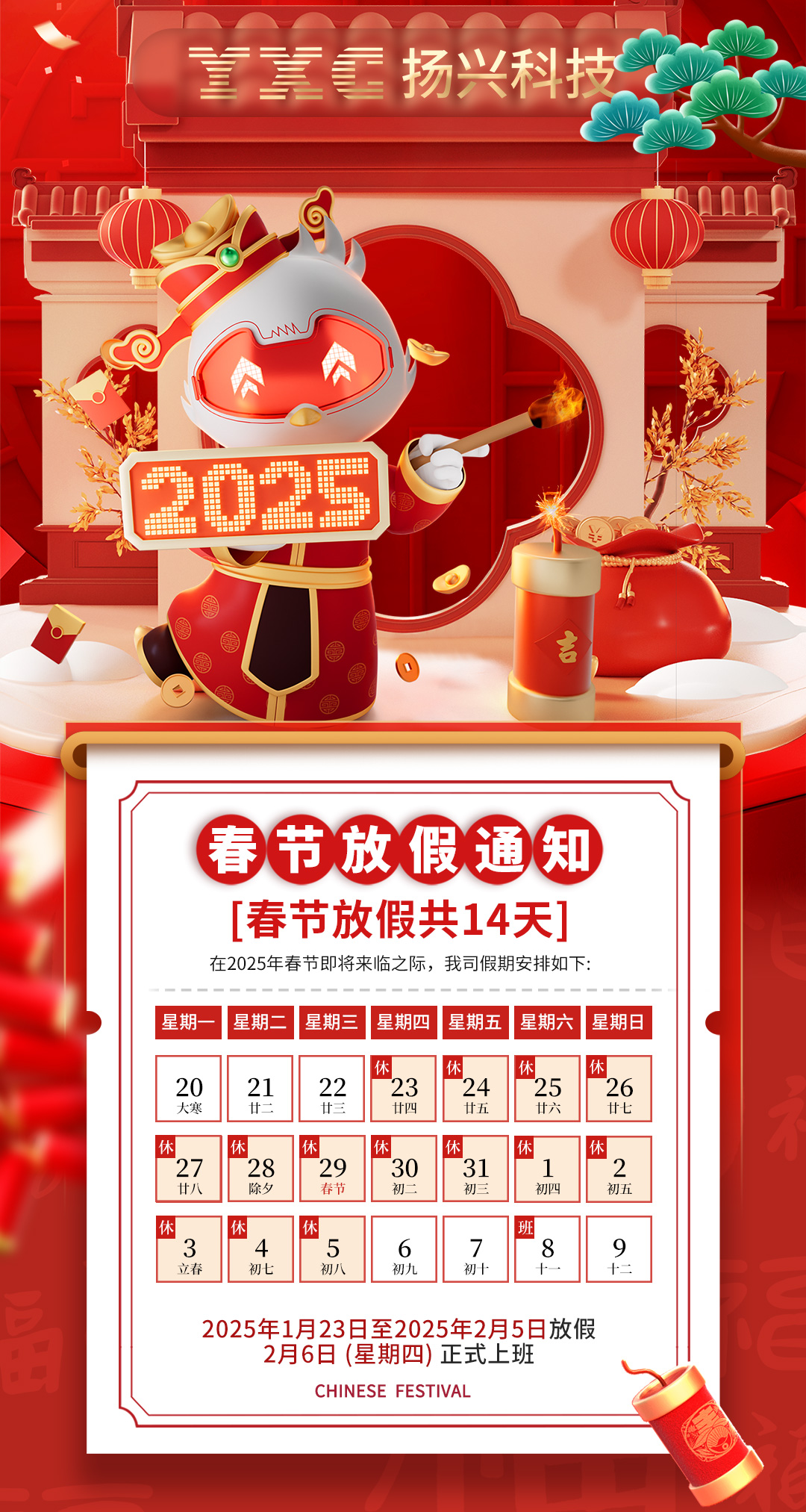 揚興總部、工廠、子公司含辦事處:2025年1月23日—2月5日放假,共計14天