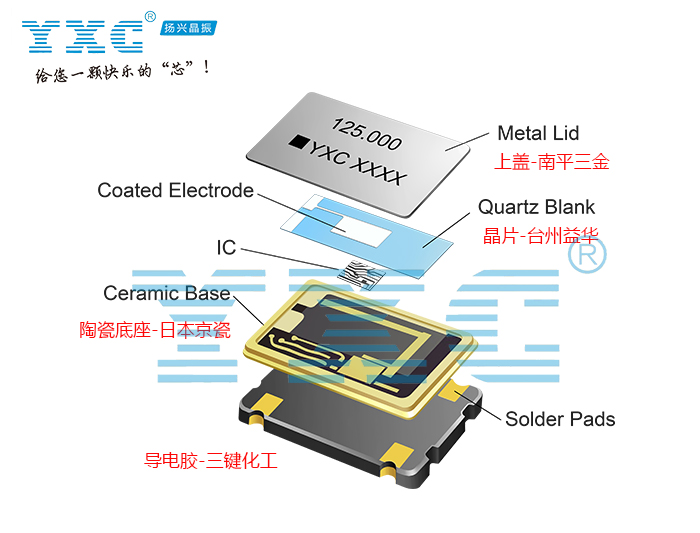 上面是YXC晶振原材料組成的來源,都是通過SGS認證;揚興晶振原材料的供應商分別為:晶振上蓋-南平三金;晶片-臺州益華;陶瓷底座-日本京瓷;導電膠-三鍵化工;揚興科技始終堅守揚興價值觀:品質為本,服務為根的原則。采用全自動化制造檢測設備,始終以零缺陷為目標,持續(xù)改進提供客戶的滿意產品。