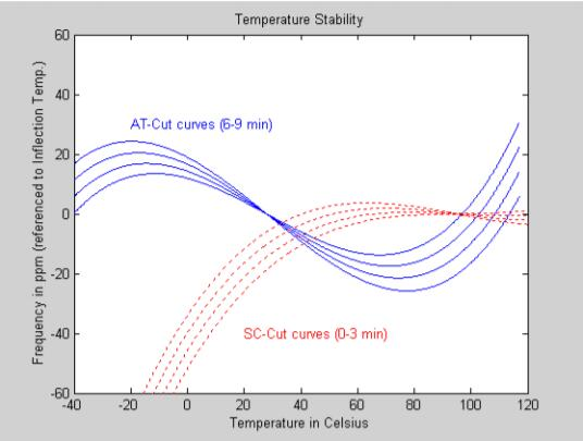 頻率與溫度穩(wěn)定性是描述晶體振蕩器的頻率輸出如何隨溫度變化的規(guī)范。FvT性能以十億分之幾或 PPB 來衡量。SC切割將改善振蕩器的性能。主要原因是晶體轉(zhuǎn)折點附近曲線的斜率。通常,SC切割的斜率是具有相同轉(zhuǎn)折點的 AT切割斜率的 1/3。SC切割提高 FvT性能的另一個領(lǐng)域是在井下應(yīng)用中看到的高溫范圍(-20℃至+200℃)下運行。與AT的+27℃相比,拐點溫度約為+90℃,SC將在這些范圍內(nèi)實現(xiàn)更嚴格的穩(wěn)定性。在這個擴展的溫度范圍內(nèi),改進可能高達5倍。