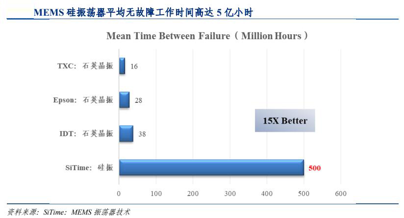 石英晶振不同的工作頻率對(duì)應(yīng)不同的切割角度和切割方式,小型化后質(zhì)量穩(wěn)定性難以保障。此外,石英晶振老化后,可能導(dǎo)致密封在金屬殼與基座空腔內(nèi)的惰性氣體“漏氣”。一旦晶體表面的銀被氧化,產(chǎn)品將出現(xiàn)故障。石英產(chǎn)品平均無故障工作時(shí)間僅為 3 千萬小時(shí)。而硅 MEMS 晶振生產(chǎn)時(shí)采用完全半導(dǎo)體工藝,保證了量產(chǎn)產(chǎn)品的品質(zhì)一致性;且硅晶振采用先進(jìn)工藝進(jìn)行真空密封,無“氣密性”問題。SiTime 晶振公司測(cè)試數(shù)據(jù)顯示,硅晶振平均無故障工作時(shí)間可高達(dá) 5 億小時(shí)。