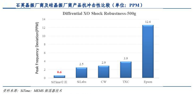 石英晶振工作頻率與晶片厚度成反比,晶片太薄則容易碎裂。工作頻率為 40MHz 的石英晶振,對(duì)應(yīng)晶片厚度僅為 0.04mm。因此,高頻石英產(chǎn)品在運(yùn)輸過程中容易碎裂。而 MEMS硅晶振輕巧的設(shè)計(jì)和先進(jìn)的架構(gòu),使其具有良好的抗沖擊能力。根據(jù) SiTime晶振 公司測(cè)試報(bào)告顯示,硅晶振抗沖擊性是石英晶振 10 倍以上。