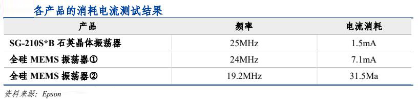 Epson晶振在 3.3V 電源電壓、+25℃且負(fù)載電容等于 10pF 的條件下各振蕩器耗電量測(cè)試數(shù)據(jù)顯示,石英晶體振蕩器采用波源基波振蕩方式,結(jié)構(gòu)簡潔,耗電量較低。而全硅 MEMS振蕩器結(jié)構(gòu)復(fù)雜,電流消耗要顯著高于石英晶振。
