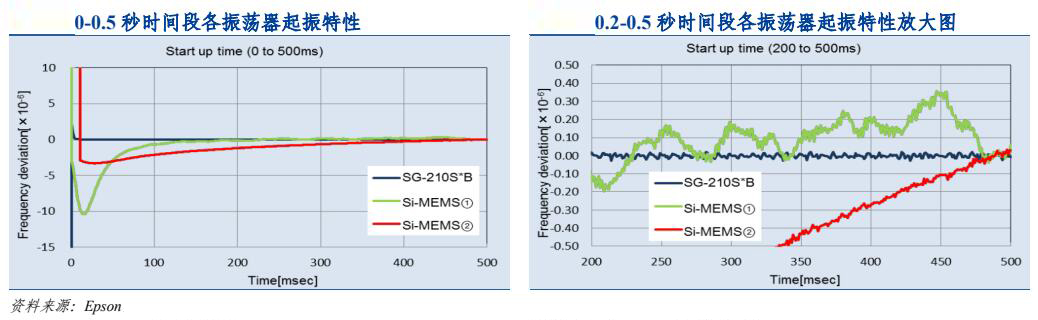 根據(jù) Epson 晶振對(duì) 0-0.5 秒時(shí)間段中,在 3.3V 電源電壓、+25℃的條件下各振蕩器通電后的起振特性的測(cè)試結(jié)果:以頻率偏差在±10*10-6 以內(nèi)的穩(wěn)定所用時(shí)間進(jìn)行比較,石英晶體振器的振蕩頻率在 1.5 毫秒以內(nèi)實(shí)現(xiàn)穩(wěn)定;全硅 MEMS 振蕩器①約需 90 毫秒;受頻率補(bǔ)償方式的影響,相位抖動(dòng)特性較好的全硅 MEMS 振蕩器②約需 250 毫秒。