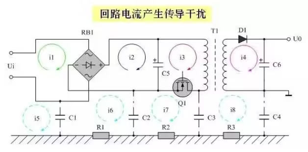 當(dāng)電路存在數(shù)個(gè)回路電流,可將每個(gè)回路視為一個(gè)感應(yīng)線(xiàn)圈,或變壓器線(xiàn)圈的初、次級(jí)。當(dāng)某個(gè)回路中有電流流過(guò)時(shí),另外一個(gè)回路中就會(huì)產(chǎn)生感應(yīng)電動(dòng)勢(shì),從而產(chǎn)生干擾。最有效減少干擾的方法就是盡量減少每個(gè)回路的有效面積。