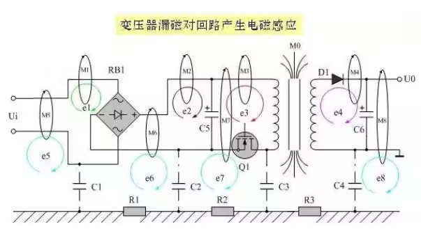 對(duì)變壓器進(jìn)行磁屏蔽、盡量減少每個(gè)電流回路的有效面積,圖中的電磁感應(yīng)干擾,最為嚴(yán)重的是變壓器漏感所產(chǎn)生。若將變壓器的漏感視為變壓器感應(yīng)線(xiàn)圈的初級(jí),則其它回路可視為是變壓器的次級(jí),所以在變壓器周?chē)幕芈分?,都?huì)被感應(yīng)產(chǎn)生干擾信號(hào)。減少干擾的方法,一是對(duì)變壓器進(jìn)行磁屏蔽,二是盡量減少每個(gè)電流回路的有效面積。