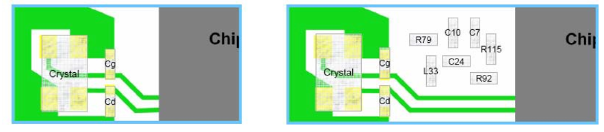 由于晶振為干擾源,本體下方所有層原則上不準許走線,特別是關鍵信號線,要保證晶振周圍的沒有其他元件,防止器件之間的互相干擾,影響時鐘和其他信號的質量。若濾波器器件放在晶振下方,且濾波電容與匹配電阻未按照信號流向排布,會使濾波器的濾波效果變差。