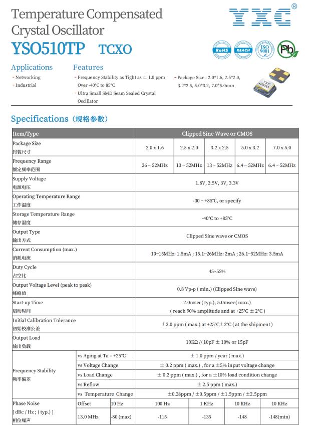 YXC TCXO溫補(bǔ)晶振YSO510TP系列特點(diǎn)如下: