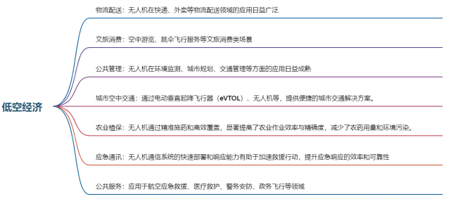 低空經(jīng)濟(jì)領(lǐng)域的主要產(chǎn)品包含無人機(jī)(消費(fèi)級、工業(yè)級)、直升機(jī)、傳統(tǒng)固定翼飛機(jī)以及eVTOL(電動垂直起降飛行器)等飛行器設(shè)備。包含的應(yīng)用場景豐富且多樣,包括但不限于: