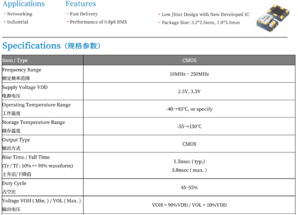 YSO511PJ為預(yù)編程TCXO。在-40~85℃的工作溫度范圍內(nèi),溫度穩(wěn)定性≤±2.5PPM、輸出方式為CMOS。該產(chǎn)品可滿足10~250MHz范圍內(nèi)任意頻率定制,適用于特殊頻率需求方案。