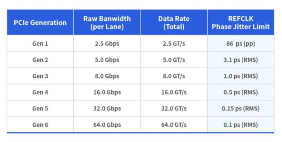 隨著PCIe版本的升級(jí),參考時(shí)鐘的性能要求也大幅提高,下表展示了不同PCIe協(xié)議版本對于參考時(shí)鐘RMS抖動(dòng)的要求: